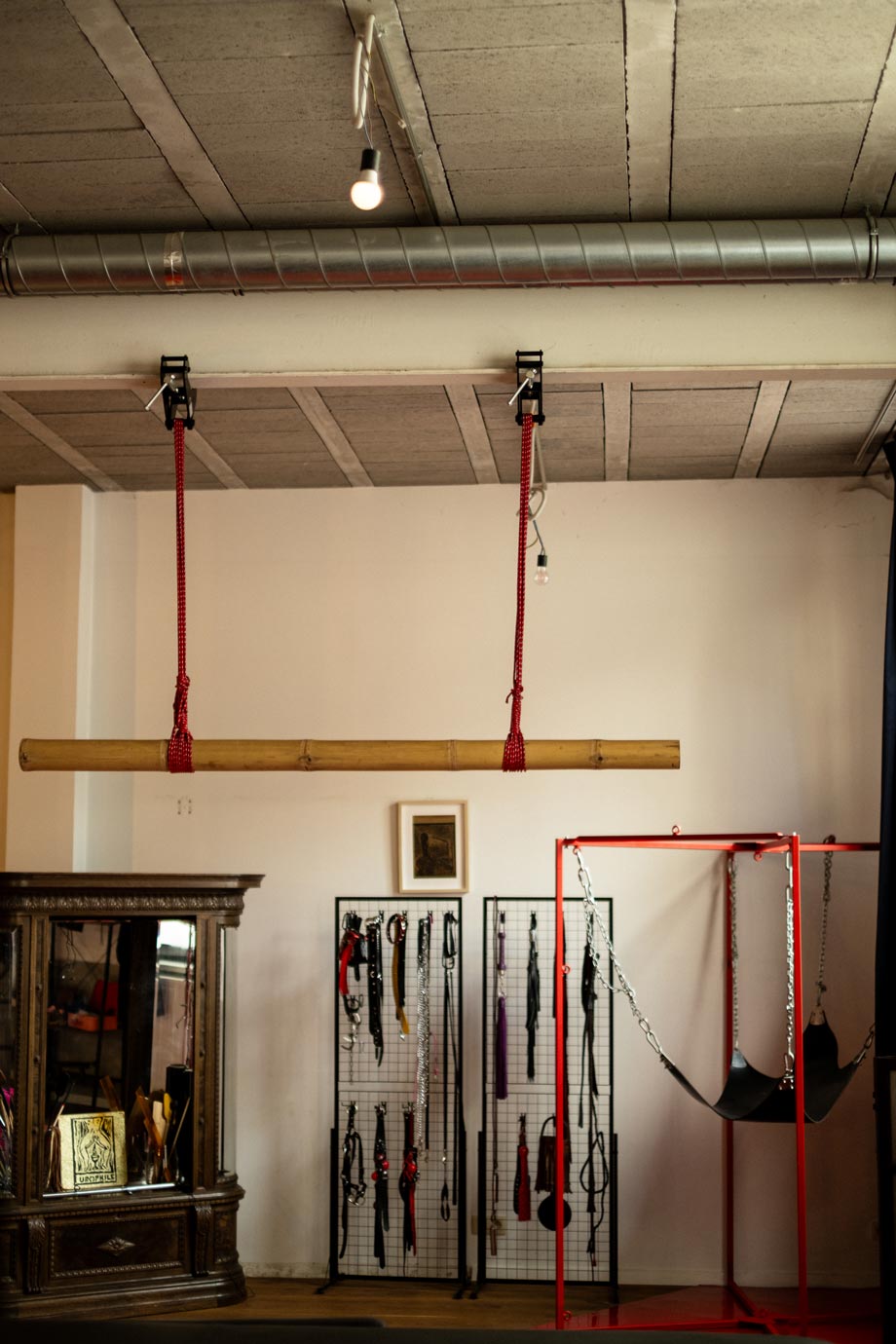 Le studio est spacieux et comprend différents espaces réservés à différentes pratiques telles que le fouet, la suspension ou les jeux médicaux.
