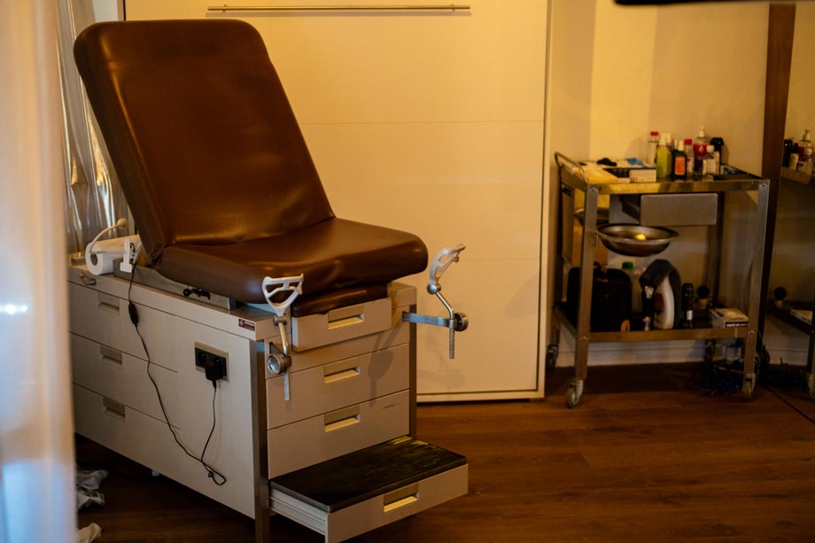 Dans un autre espace plus petit, vous trouverez tout le nécessaire pour les jeux médicaux : une chaise gynécologique pour vous maintenir bien ouvert ainsi que des outils médicaux et des lampes pour une exploration en profondeur.
